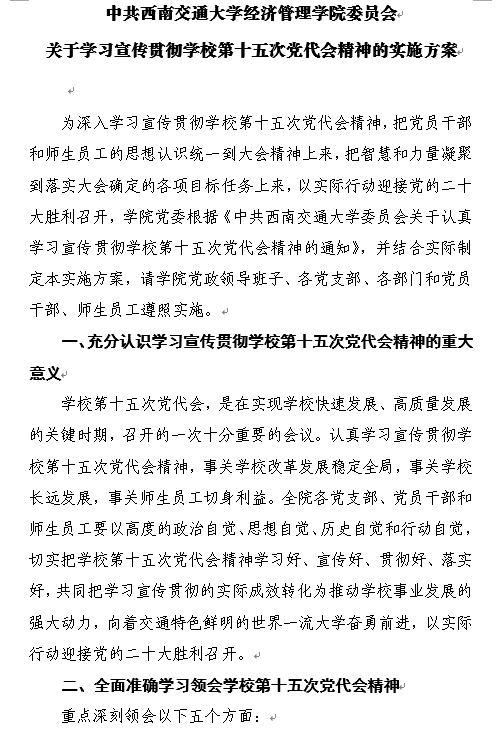 委员会关于学习宣传贯彻学校第十五次党代会精神的实施方案》。方案根据学校党委关于认真学习宣传贯彻学校第十五次党代会精神的通知要求,结合实际,明确了全面准确学习领会学校第十五次党代会精神的主要内容、具体安排和落实要求。方案指出,要充分认识学习宣传贯彻学校第十五次党代会精神的重大意义,抓好学院党委理论学习中心组、各党支部书记、各部门负责人、全体党员、全院教职工等不同群体的学习培训,学院党委委员、党代表、党支部书记、各部门负责人要带头学习、带头宣讲,运用“微党课”“故事会”等灵活多样的形式,从“小切口、小案例”入手贴近实际、贴近师生做好宣讲,并广泛开展宣传,要将贯彻落实学校第十五次党代会精神和重点任务情况纳入学院重点工作及党建工作考核、年度考核范围,加强监督检查,确保党代会各项任务要求落到实处。