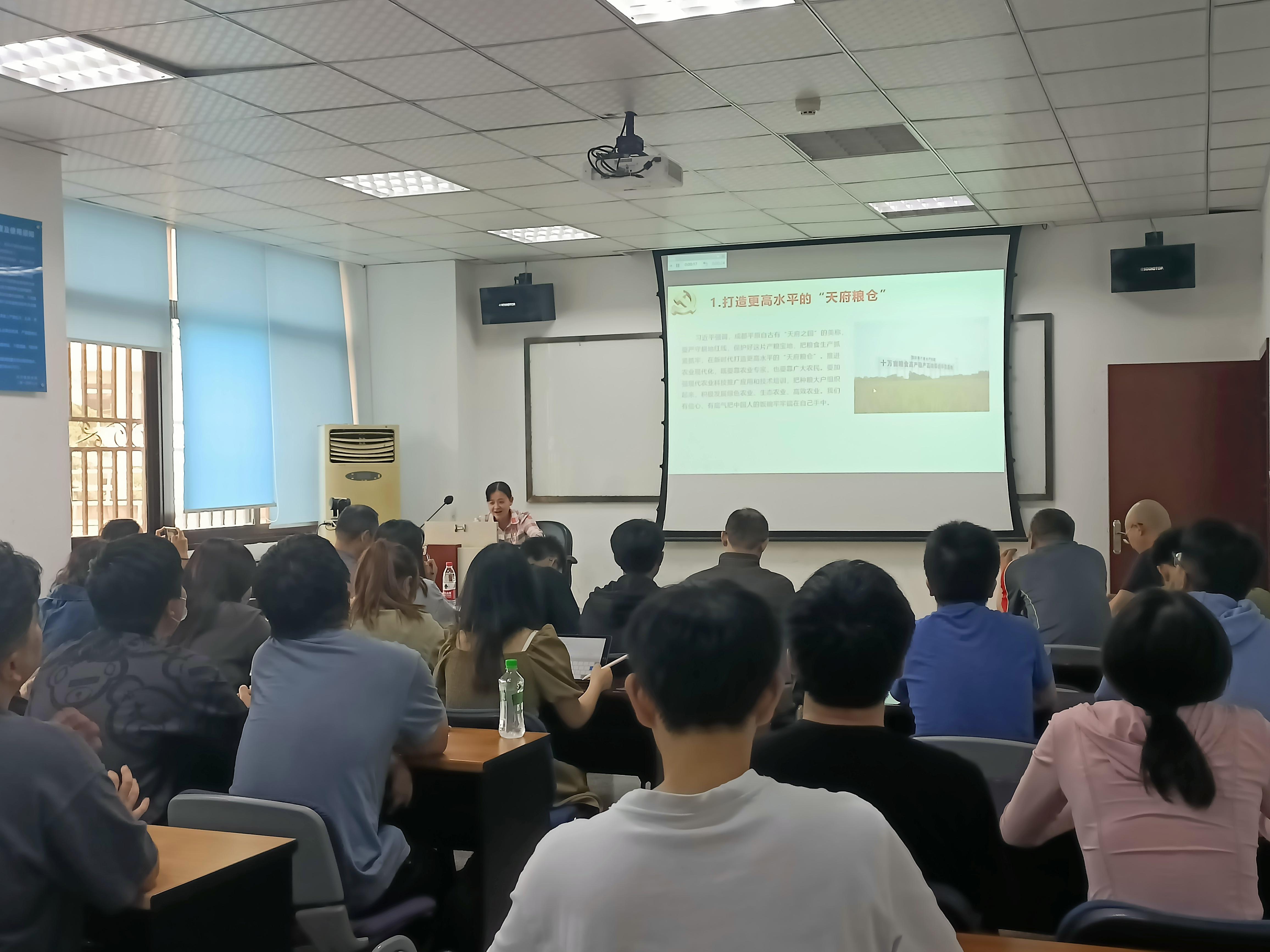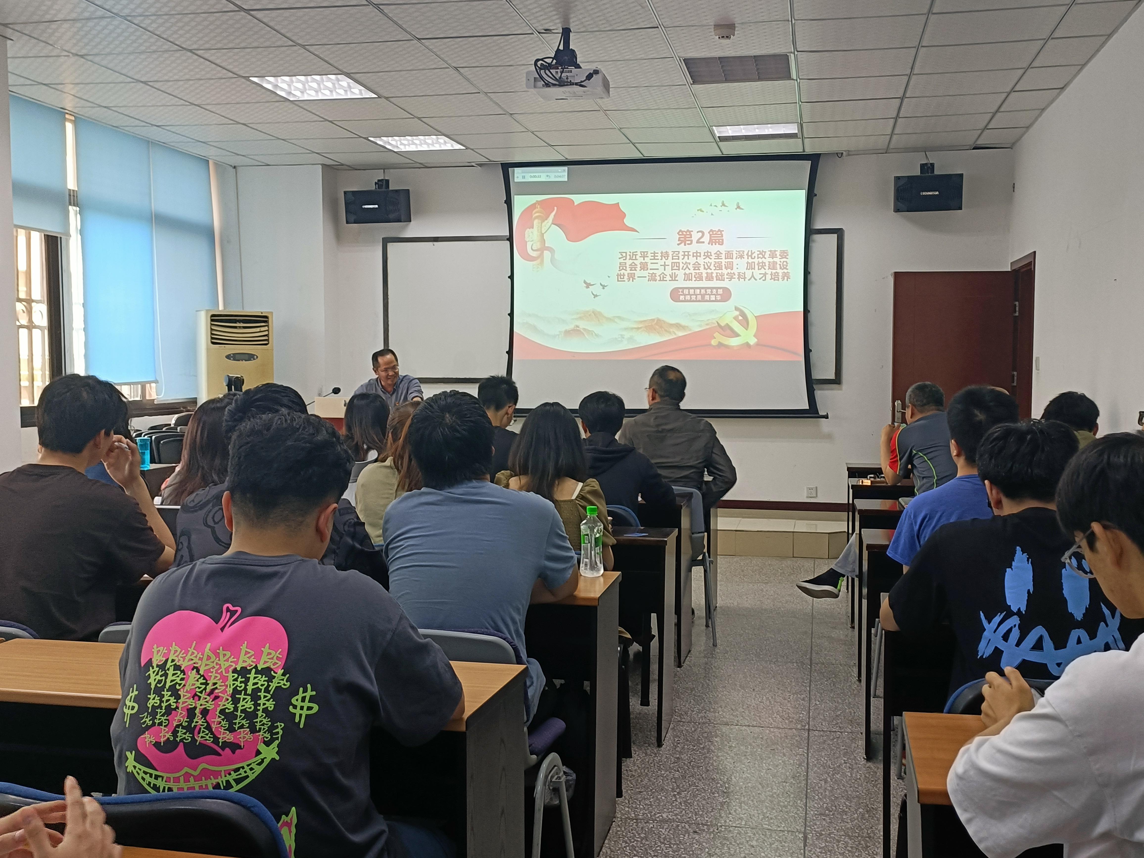 活动第一部分为党员领学述学。工程管理系党支部教师党员张静、周国华、支部书记苏兆国分别对《习近平总书记在四川考察讲话》《中央全面深化改革委员会第二十四次会议精神》《习近平在中共中央政治局第三次集体学习时的讲话》进行领学述学。教师党员们从乡村振兴战略引申到学生就业导向,从如何打造创新强国到讲解分析科技人才评价改革工作方案,从提倡重视基础研究讲到要加强科技自立自强与高水平人才培养,多方面励青年同志认真聆听时代呼唤,自觉担负起时代赋予的使命任务,学习科技知识、发扬科学精神。