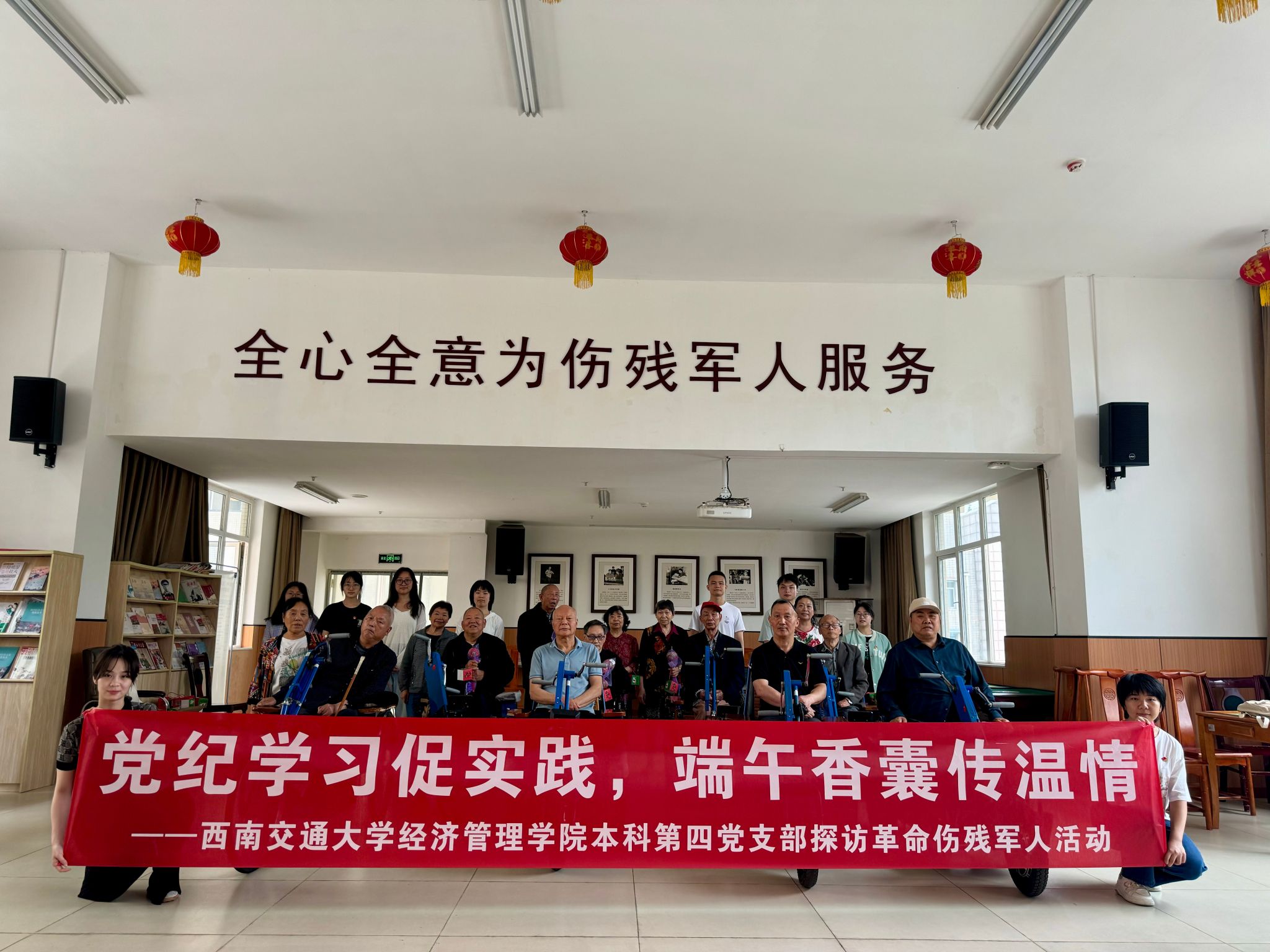 为传承红色基因,强化党性教育,6月7日,在支部书记张先凌和副书记钟文婷的带领下,支部组织新接收的预备党员前往四川省革命伤残军人休养院看望革命伤残军人。支部成员与伤残军人亲切交流,聆听他们的革命故事,为他们送上了端午香囊和艾草锤,向前辈们汇报了党纪学习教育的心得体会,在革命军人的点拨下深受启发。