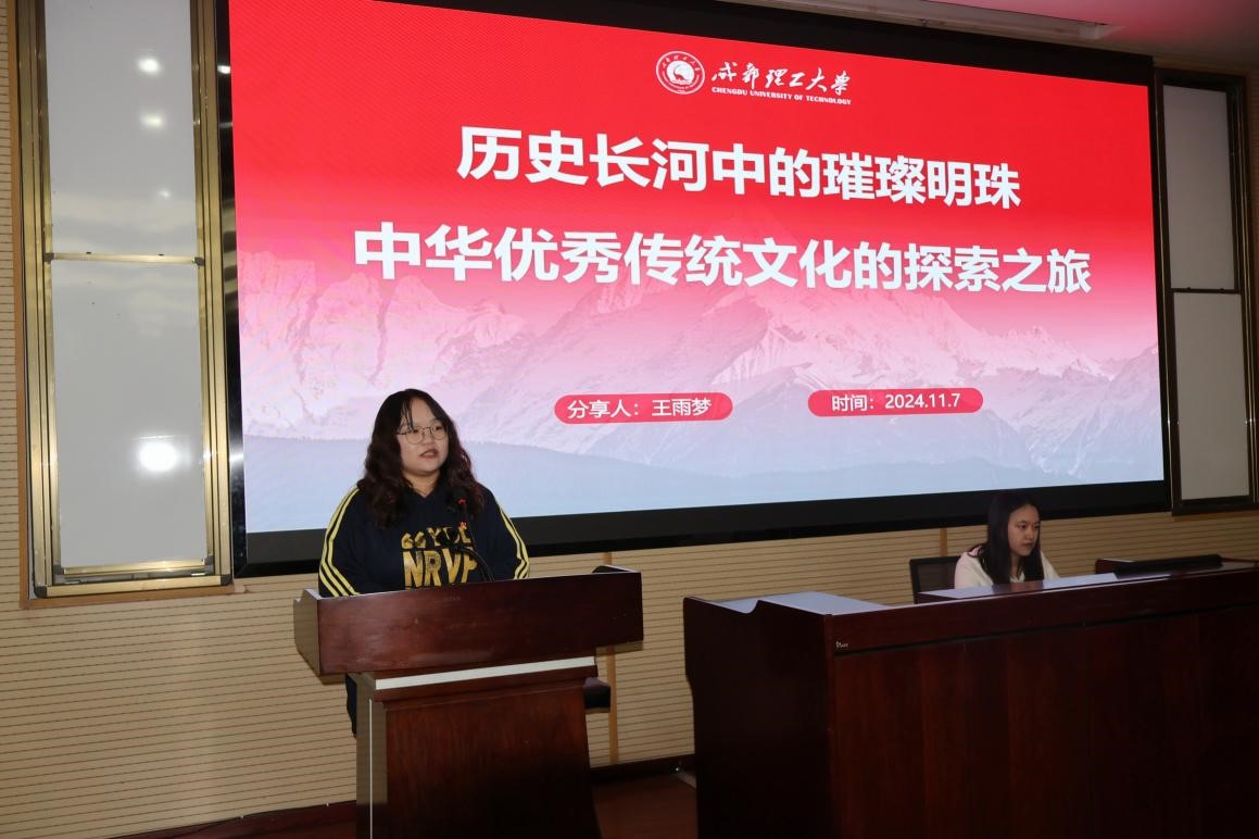 在本环节最后,成都理工大学地理与规划学院旅游开发与管理系学生党支部党员王雨梦,带来了“历史长河中的璀璨明珠:中华优秀传统文化的探索之旅”主题分享,激励大家传承和弘扬承载民族智慧与文化自信的中华优秀传统文化,在全球化浪潮下,以坚定信念推动中华民族伟大复兴。