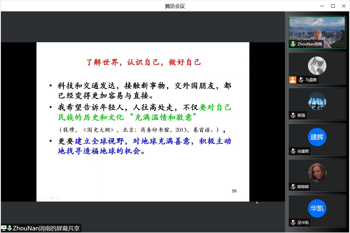 讲座尾声,周南教授引用钱穆先生《国史大纲》的卷首语“对自己的历史文化,须具温情与敬意”,对师生提出“建立全球视野,对地球充满善意,积极主动地找寻造福地球的机会”的期望,并详细解答了线上师生的问题。蒋玉石教授对周南教授的精彩分享致以诚挚的感谢,希望包子漫画