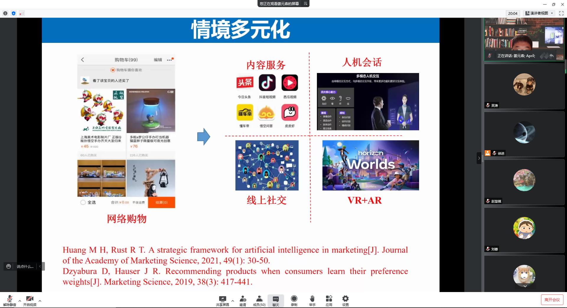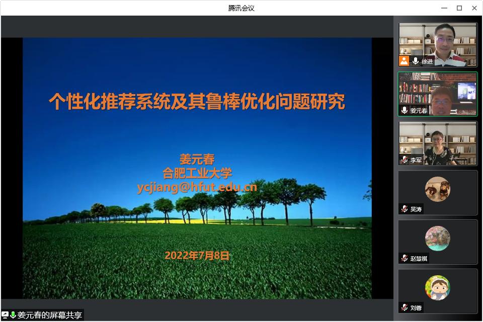 2022年7月8日上午9点30分,合肥工业大学管理学院姜元春教授应邀以“个性化推荐系统及其鲁棒优化问题研究”为题在线上为学院师生带来了一场精彩的学术分享,本次学术活动由学院信息系统与运营管理系徐进副教授主持,学院副院长聂佳佳教授、学院教授委员会副主任李军教授、刘盾教授、实验室执行主任耿维副教授及40多名研究生参加了本次线上学术活动。