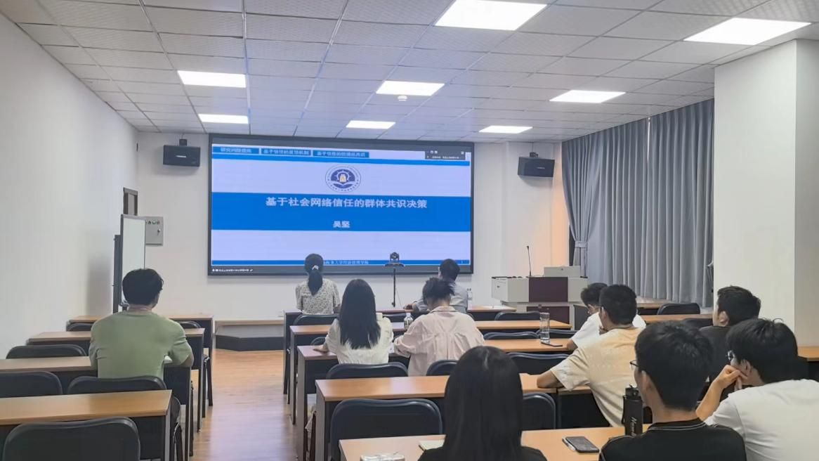 吴坚教授展开了题为“基于社会网络信任的群体共识决策”的分享。他系统地讨论了信任传递模型、群决策中的信任反馈机制及基于信任的防操作共识等问题,并通过实际算例说明了这些方法的实用性和有效性。吴教授指出,传统群体共识通常使用静态方法集结用户偏好,而基于社会网络信任的群体共识决策方法则考虑到群体成员之间的交互关系,从而有效提高了群体的满意度和推荐的准确性。