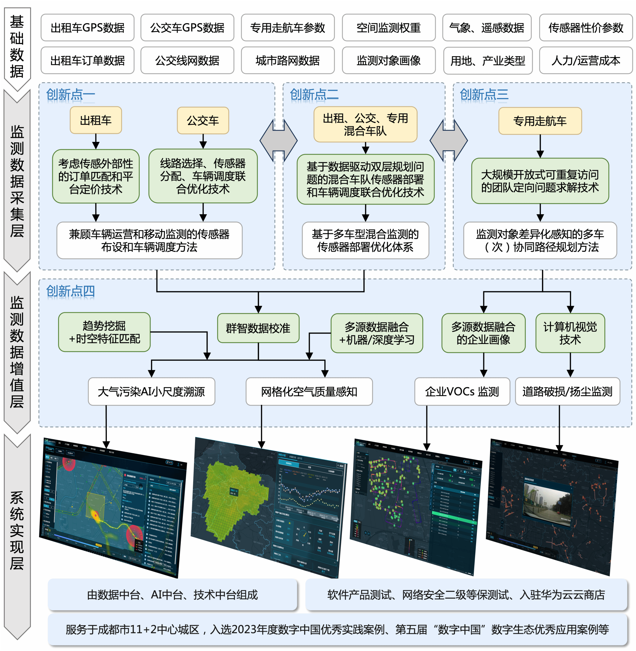 然而,大气监测所用的搭载车辆(常见的如出租车、公交车、专用车)在城市空间中的流动呈现复杂性、随机性、时变性、偏倚性和稀疏性,难以与监测场景的需求进行匹配,影响数据采集和后续应用。此外,移动大气传感数据存在应用单一、挖掘不足、与业务场景脱节等问题,急需智能化数据挖掘应用体系用于调度和决策支持。针对以上行业难点,本成果以大气监测为应用背景,创新性提出了以城市车辆为载体的大气移动感知的部署、调度及决策综合技术体系,具体如下(详见技术构架图):