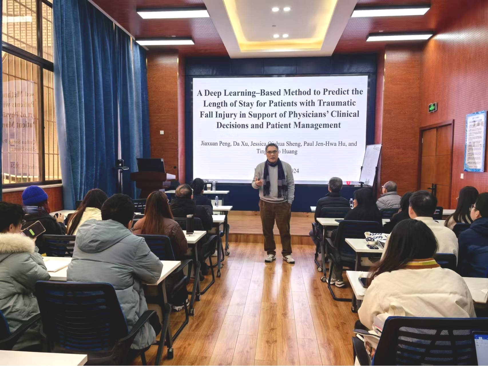师生带来一场题为“A Deep Learning–Based Method to Predict the Length of Stay for Patients with Traumatic Fall Injuries in Support of Physicians’ Clinical Decisions and Patient Management”的学术讲座。本次学术活动由学院副院长马锋教授主持,学院部分教师及研究生40余人参加此次学术活动。副院长马锋介绍了胡仁华教授的学术背景与成就,并对胡教授的到来表示热烈欢迎。