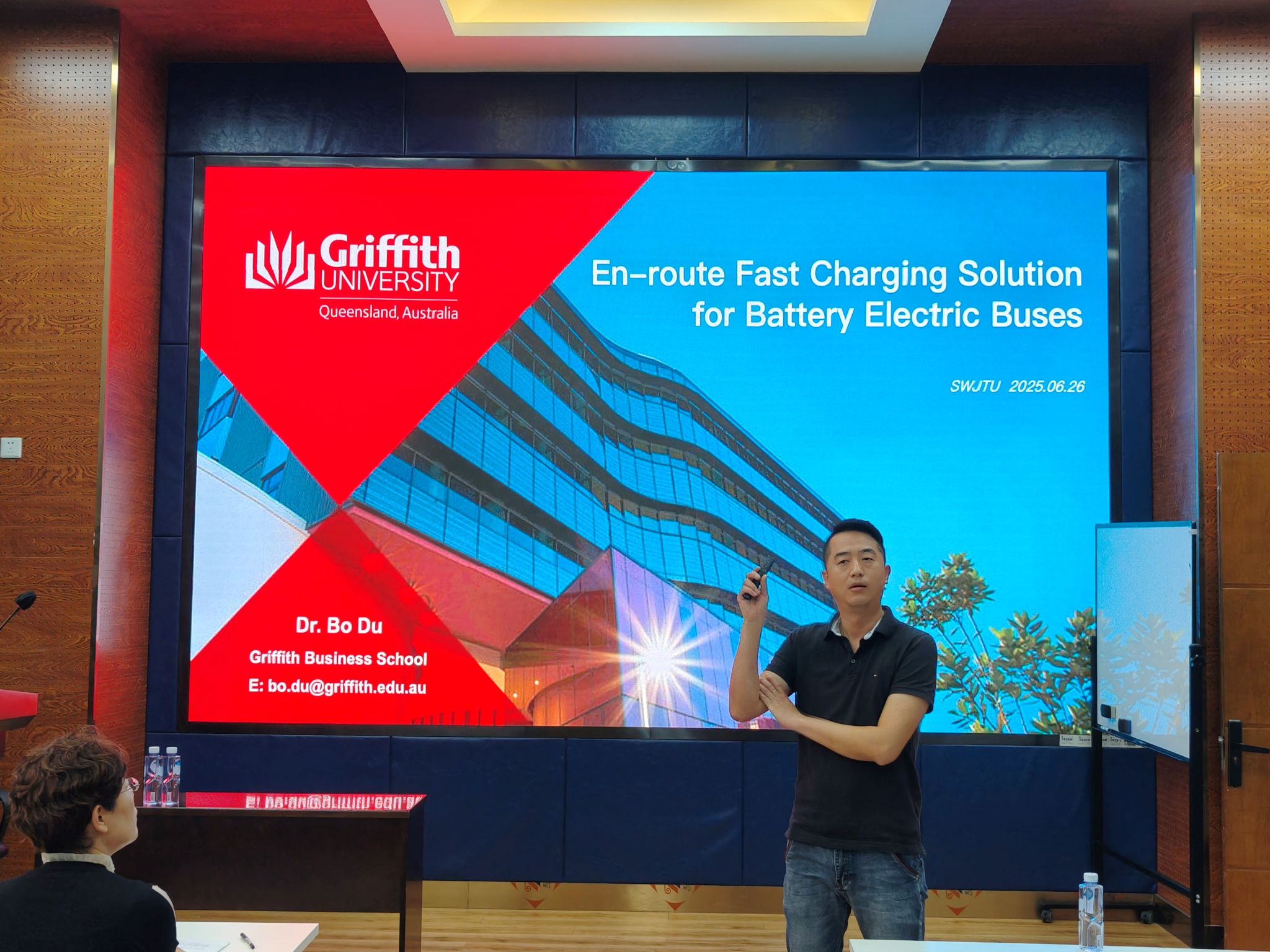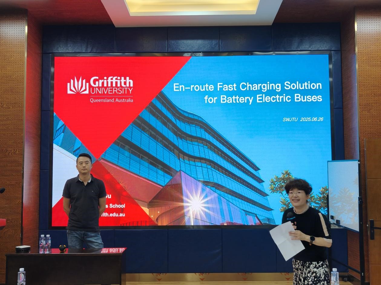 杜波老师首先介绍了格里菲斯商学院及其研究团队,并分析了澳大利亚电动公交车的发展现状,阐述了当前电池电动公交车存在的续航里程有限问题。随后其指出充电技术的不断进步使得快速充电技术成为解决电池电动公交车续航里程有限问题的一个有前景的方案,该项技术通过在公交车行驶途中提供及时充电得以实现。