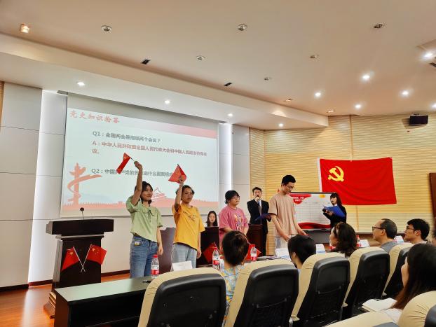 在朗诵分享期间,还穿插进行了精彩激烈的党史知识抢答比赛,选手们通过举起手中的小国旗抢答题目,检验自己对党史的了解,同时现场观众也积极参与,帮助选手回答问题。通过抢答环节,我们的党史知识得以夯实,也使我们对党有了更加深入的了解与认识。