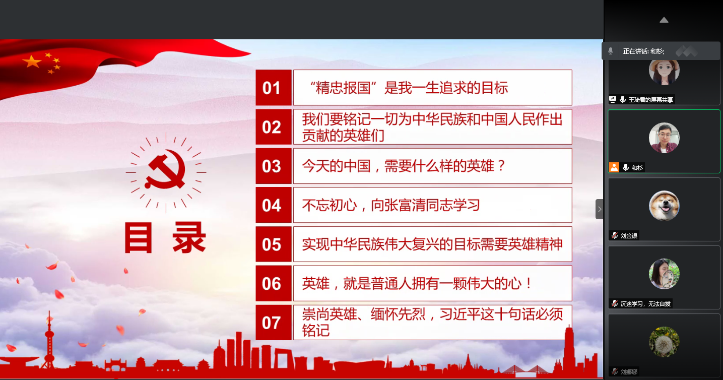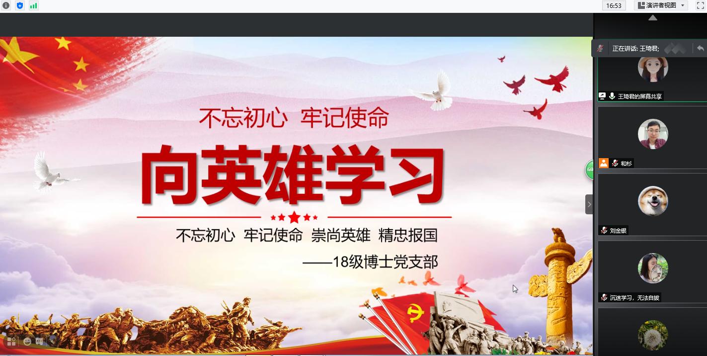 2018级博士党支部,在腾讯线上会议室,召开了“不忘初心,牢记使命,向英雄学习”文件精神领会微党课暨组织生活会。会议由2018级博士党支部书记和杉同志和支部党员王琦君同志主持,通过“微党课”的形式带领大家一起深入领会了《不忘初心,牢记使命,向英雄学习》的主要精神。通过学习革命英雄事迹和习近平总书记崇尚英雄、缅怀先烈的讲话,感悟习近平的习近平总书记的英雄情怀。