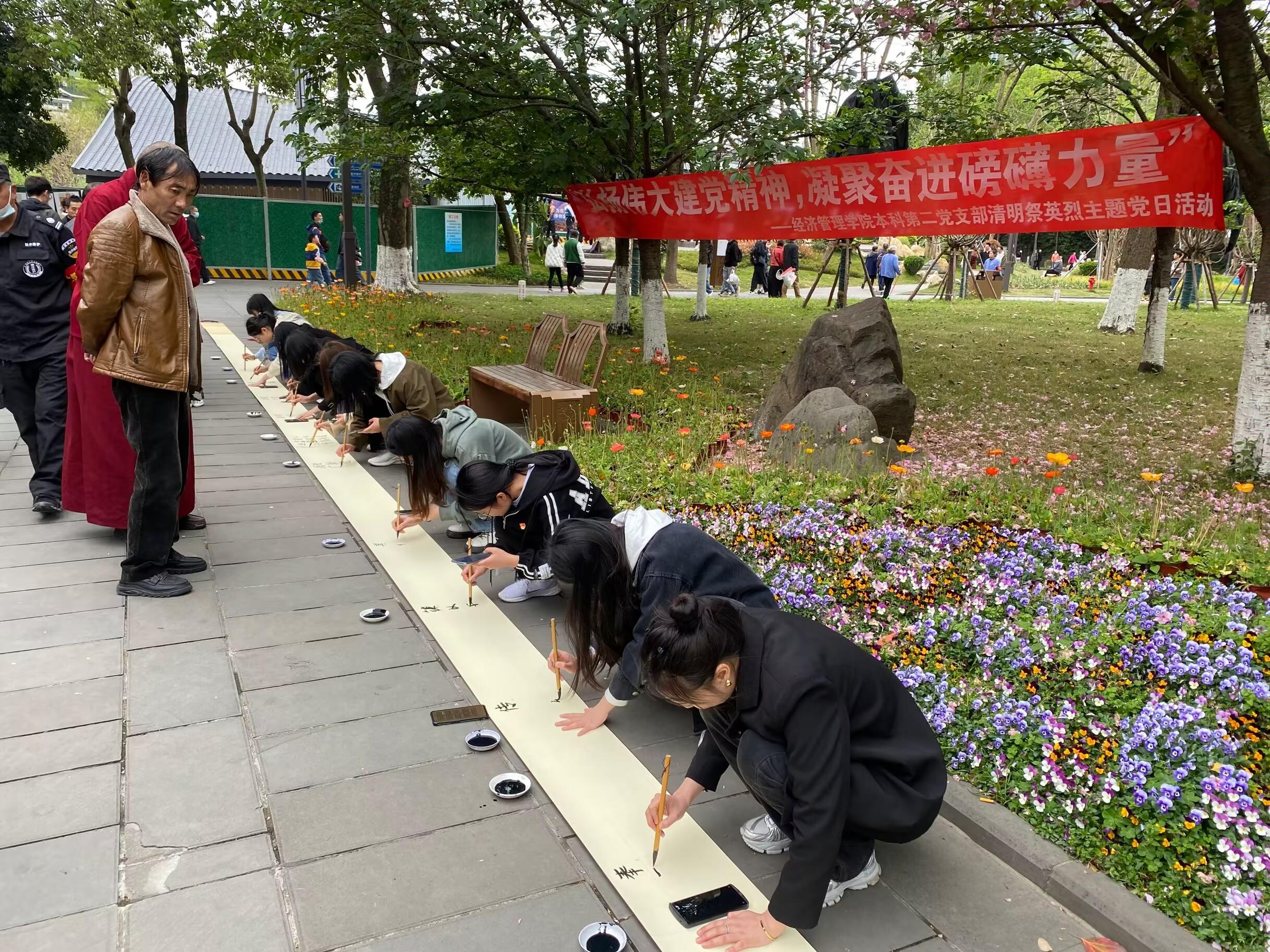 沧海横流时,他们用大仁大义在中华民族青史上写下浓墨重彩的一笔。追逐英雄足迹,支部党员也纷纷拿起笔墨,在陵园内书写《清明英烈赋》,一笔一划写下英雄的故事,“胡锋肉盾”“邱少云守纪律宁愿烈火烧身”“焦裕禄兰考播雨露”“孔繁森雪域送春”等。字字句句,书写着过往的华章;驻足回望,青年英雄是民族繁荣的精神坐标,引领着新时代青年破浪前行。党支部与九里校区茅以升图书馆提前进行了协商,党员们书写好的《清明英烈赋》最终放在图书馆进行展示。