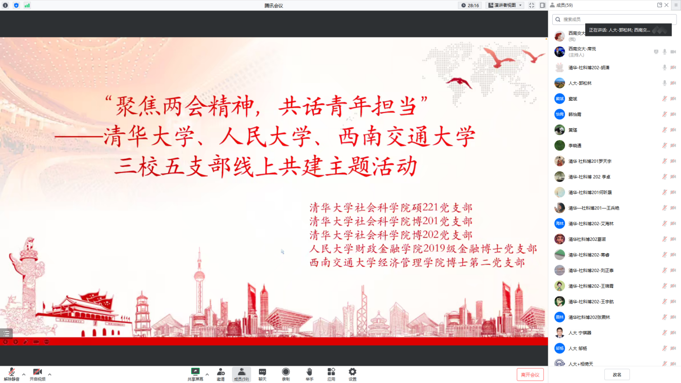 博士第二党支部联合清华大学社科硕221党支部、社科博201党支部、社科博202党支部、中国人民大学财政金融学院2019级金融博士党支部,以线上腾讯会议形式召开“聚焦两会精神内涵,共话青年担当”为主题的支部共建学习活动。此次会议由包子漫画