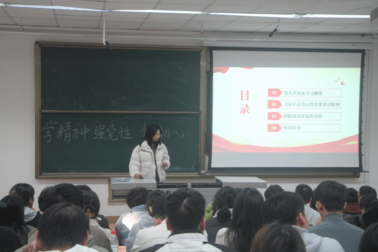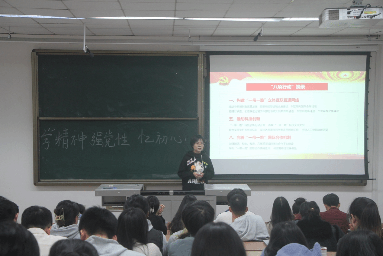 然后,本科第一党支部的彭琳芮带领大家学习领会习近平总书记在第三届“一带一路”国际合作高峰论坛开幕式上的主旨演讲精神。习近平总书记全面回顾了共建“一带一路”10年来取得的丰硕成果,深刻总结宝贵经验,系统阐述中国支持高质量共建“一带一路”的八项行动,为开启共建“一带一路”下一个金色10年指明了前进方向。我们要以习近平主席的主旨演讲精神为指引,推动共建“一带一路”经贸合作高质量发展,为建设开放型世界经济、推动构建人类命运共同体做出新贡献。