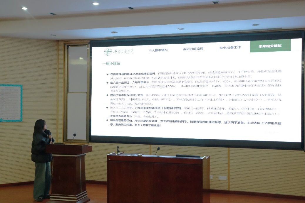 倾听心声,思而后行。孙子雁同志分别对留学、保研的时间线、材料准备、心得体会作出了详细的介绍,并将二者进行了联系与对比,此外,她还将自己在保研过程中如何确定目标、如何调整心态等经验进行了分享。留学、保研等不同毕业去向的内在联系和外在区别可以有效地帮助大家梳理职业生涯规划,树立人生目标。