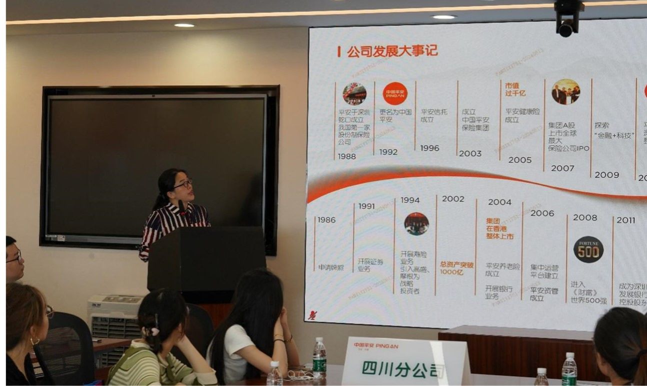 中国平安产险四川分公司的人事行政部聂丹经理向参访师生详细介绍了公司的基本情况和发展历程。她强调了中国平安在保险行业的领先地位,以及公司在产品创新、客户服务方面的不懈努力。未来,四川分公司将继续以人民为中心,提升服务实体经济和民生的能力,为全省经济高质量发展贡献力量。