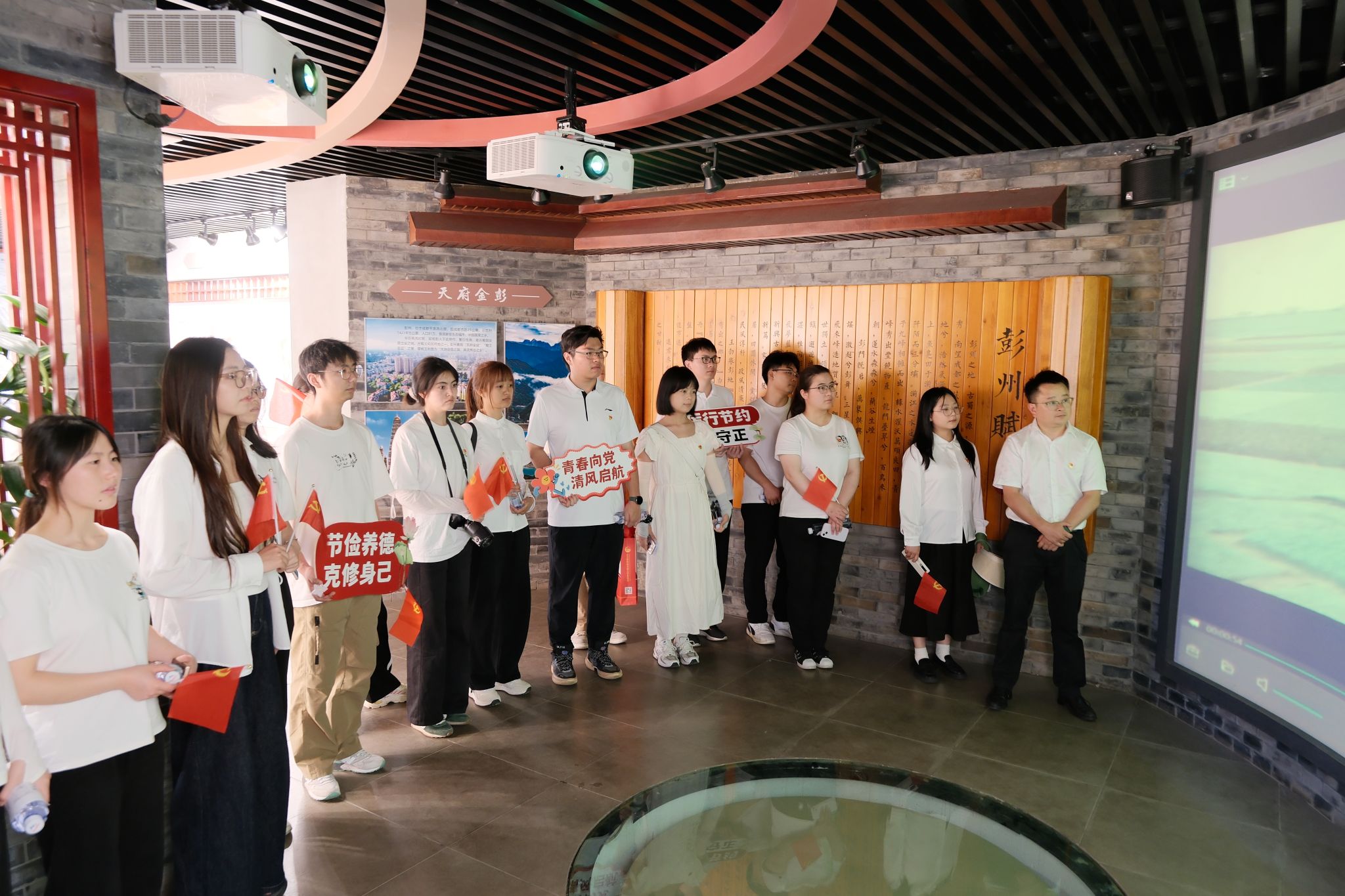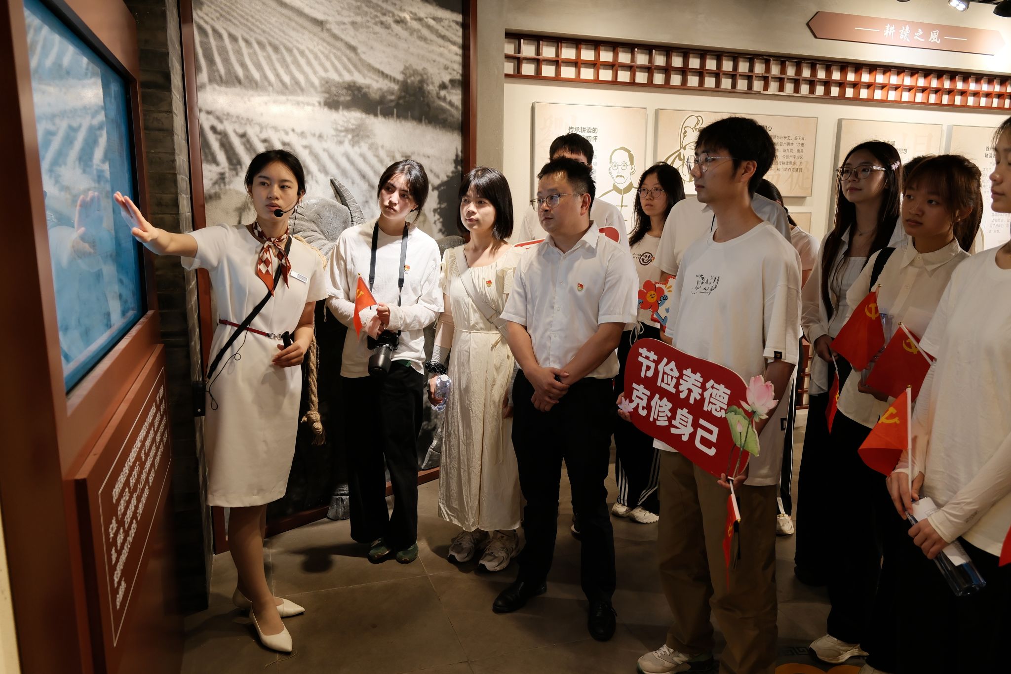 下午1:30,队伍抵达文化教育基地。在讲解员的引导下,大家参观了以“耕读”“家风”“匠心”为主题的优秀传统文化展厅。展厅内,丰富的历史展陈和互动游戏诠释了耕读文化与廉洁自律的深刻联系——耕田可养家糊口,读书能明礼修身,家风正方可身正,匠心守则不为浮华所动。这场沉浸式的文化体验,让每位同志都感受到了廉洁品德的熏陶。