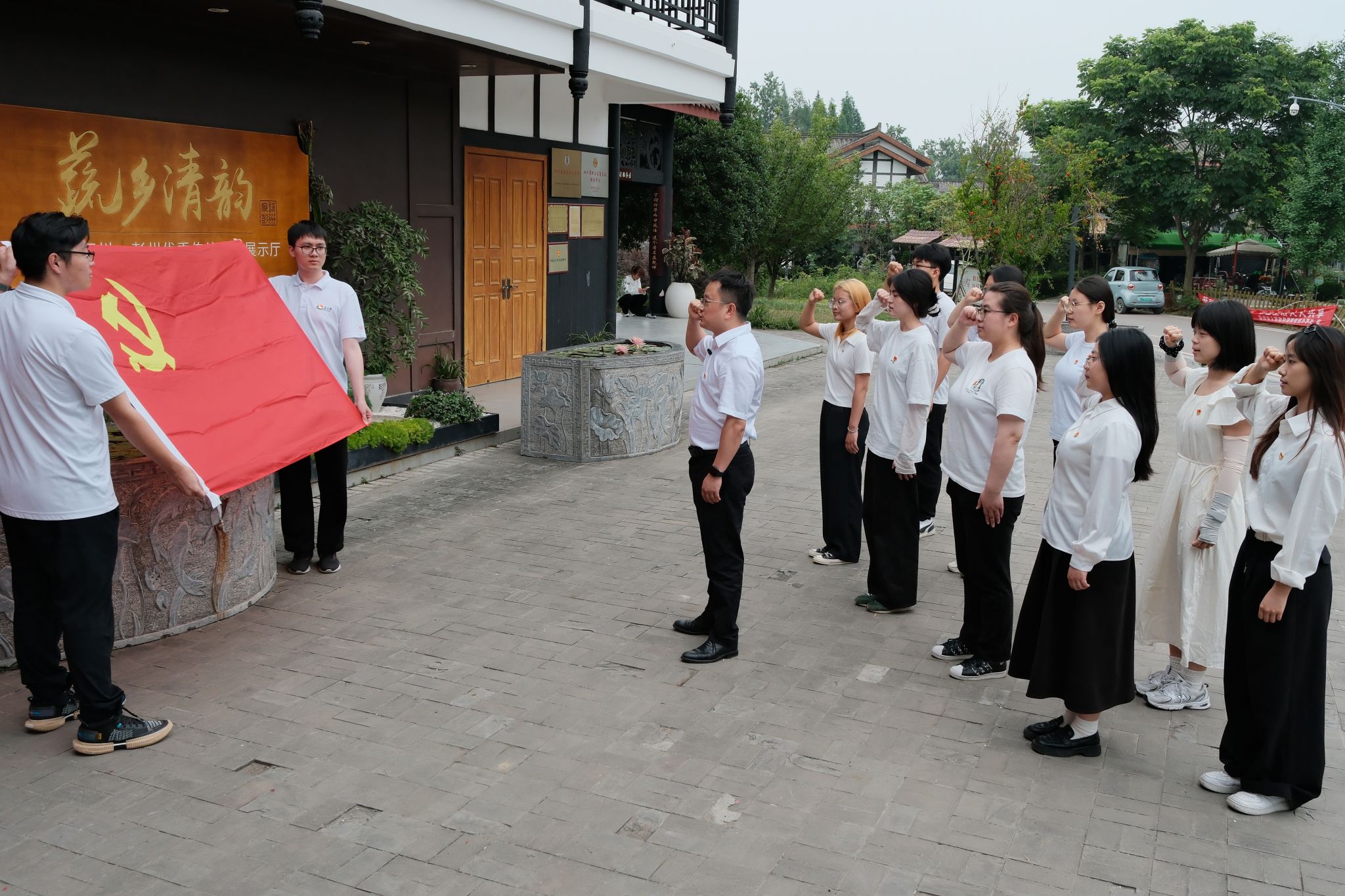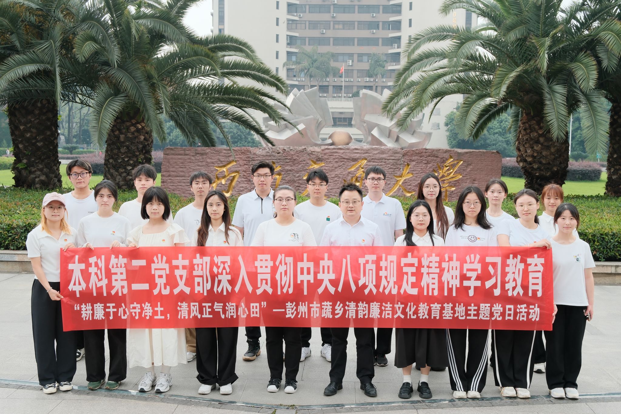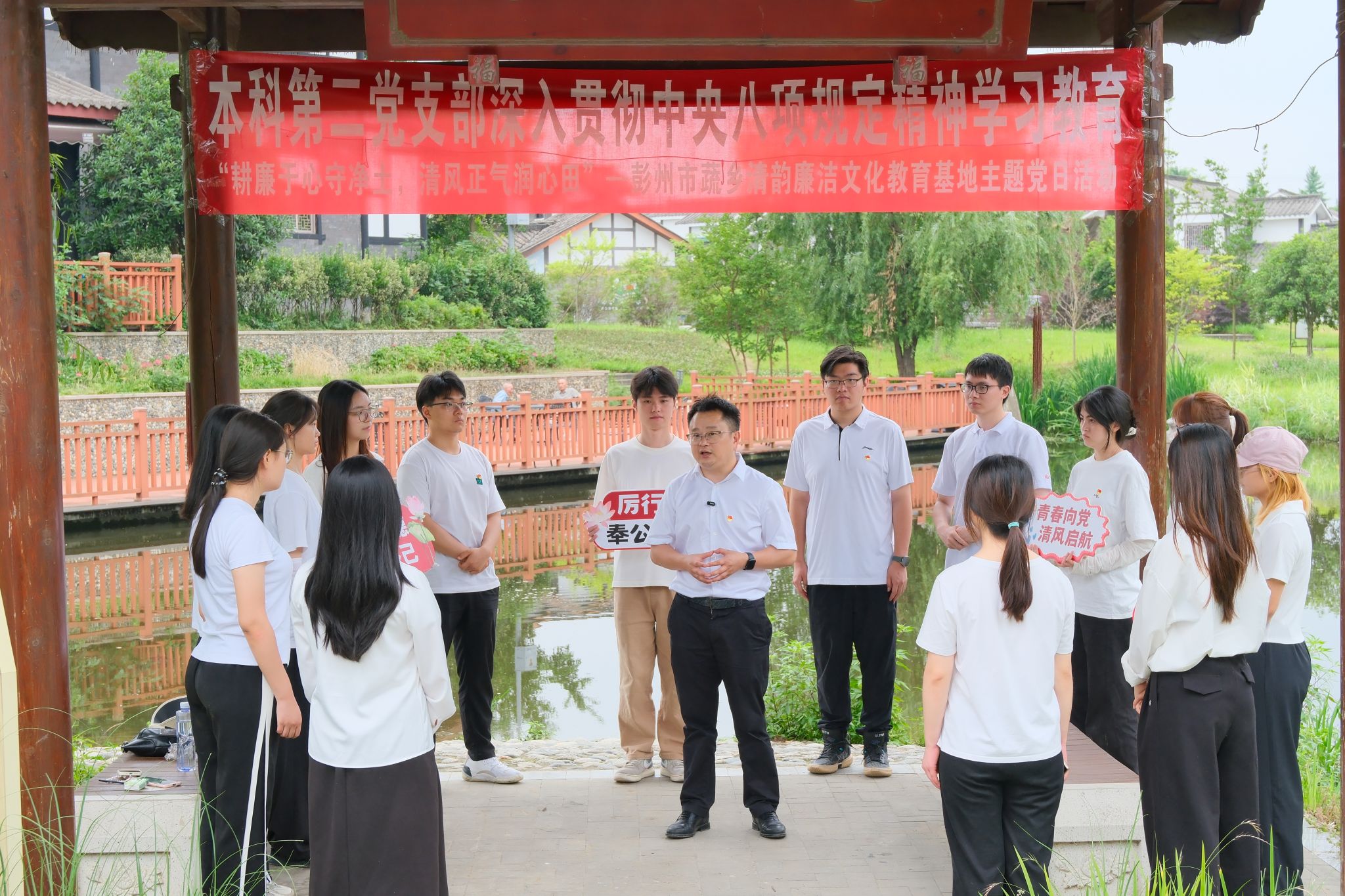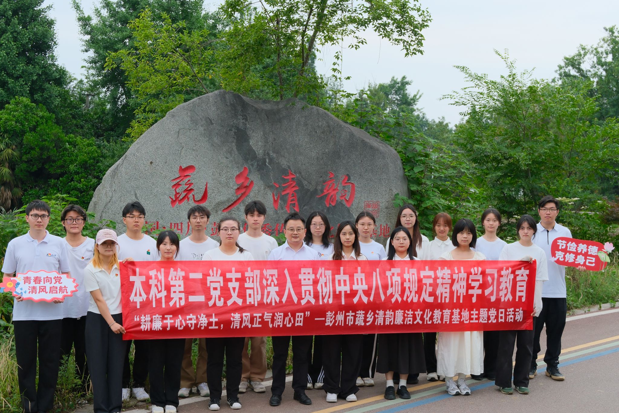 本科第二党支部19名党员、积极分子在党支部书记陈建奇的带领下,前往位于四川省彭州市的“蔬乡清韵”优秀传统文化教育基地,开展“耕廉于心守净土,清风正气润心田”深入贯彻中央八项规定精神学习教育主题党日活动。
